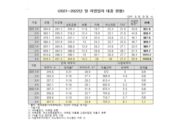 작년 말 기준 자영업자의 대출 잔액이 1천조원을 넘어서고, 이 중 다중채무자의 잔액만 720조원에 달하는 것으로 나타났다.8일 더불어민주당 진선미 의원이 한국은행에서 받은 '자영업자 대출 현황'에 따르면작년 4분기 자영업자 대출 잔액은 1천19조8천억원, 이중 다중채무..