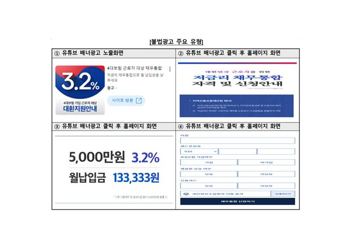 최근 '정부 지원', '서민금융' 등 정책금융을 사칭한 불법광고가 늘고 있어 소비자 주의가 요구된다.불법광고 유형으로는 서민금융진흥원과 유사한 상호를 사용하거나'정부지원 대출' 등 문구를 사용해 정부·공공기관이 운영하는 공식사이트로 오인케 하는 사례가 대표적이다.또한 ..