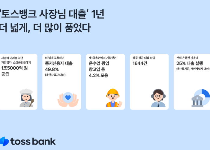 토스뱅크는 인터넷전문은행 최초로 선보인 비대면 개입사업자 대출인'토스뱅크 사장님 대출’이 출시 1년 만에 1조5000억원의 잔액을 기록했다고 20일 전했다.토스뱅크에 따르면 토스뱅크 사장님 대출은 지난달 공급 규모가 1830억원에 기록했다.개인사업자 대출을 운영 중인..
